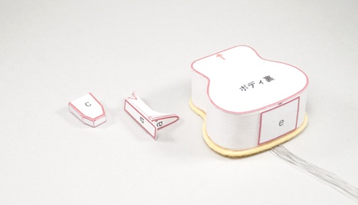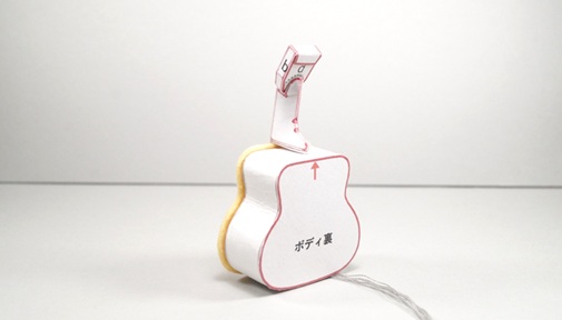 ボディの芯材にボール紙、ネック、ヘッドの芯材に画用紙を使用しているので、強度を持たせるために、厚すぎるボディ、太すぎるネックになっています。